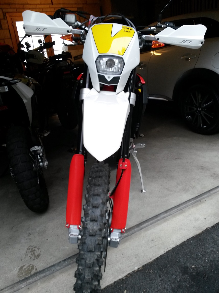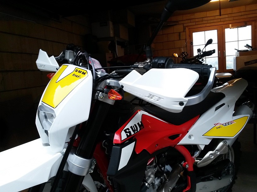 - Barkbuster Jet Alu-Handguards. finde ich vom Design her ideal passend an die kantige SWM Linienführung. Ausserdem gefallen mir die runderen Acerbis optisch weniger...ist aber Geschmackssache
