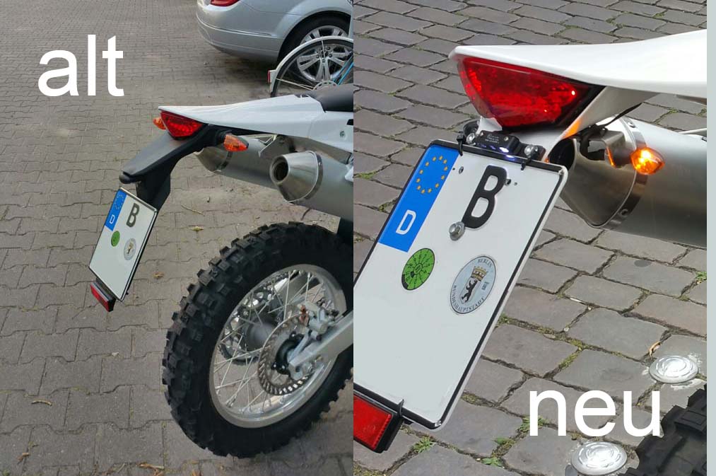 #3 selbst gebaut...erst das Riesenteil demontiert...das kurze weiße Sportheck darunter wurde mit Heißluftfön in erträgliche Form gebracht, ist aber zu schwach für ein großes Kennzeichen. Daher mit zurechtgebogenem Edelstahlstreifen verstärkt. Kennzeichen, Rückstrahler und Kennzeichenbeleuchtung auf eine Kunststoffplatte montiert. Mit 3 Schrauben schnell demontierbar (vorher 2, vernachlässigbarer Mehraufwand...). Blinkerhalter aus Edelstahl zurechtgebogen und mit den Halteschrauben des Rücklichtes verschraubt...Finito...Auf der Piste genausoschnell abgebaut wie das Originalheck...
