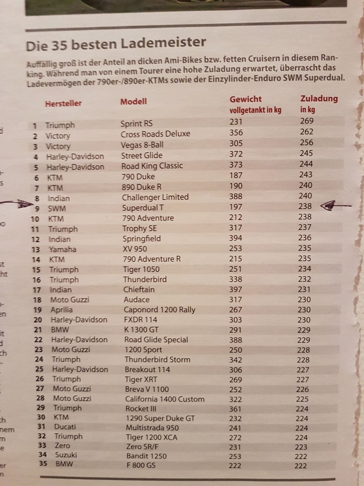 Und hier noch eine Übersicht über die "Lademeister" unter den Mootrrädern, die Superdual ist ganz vorne dabei :thumbup:
