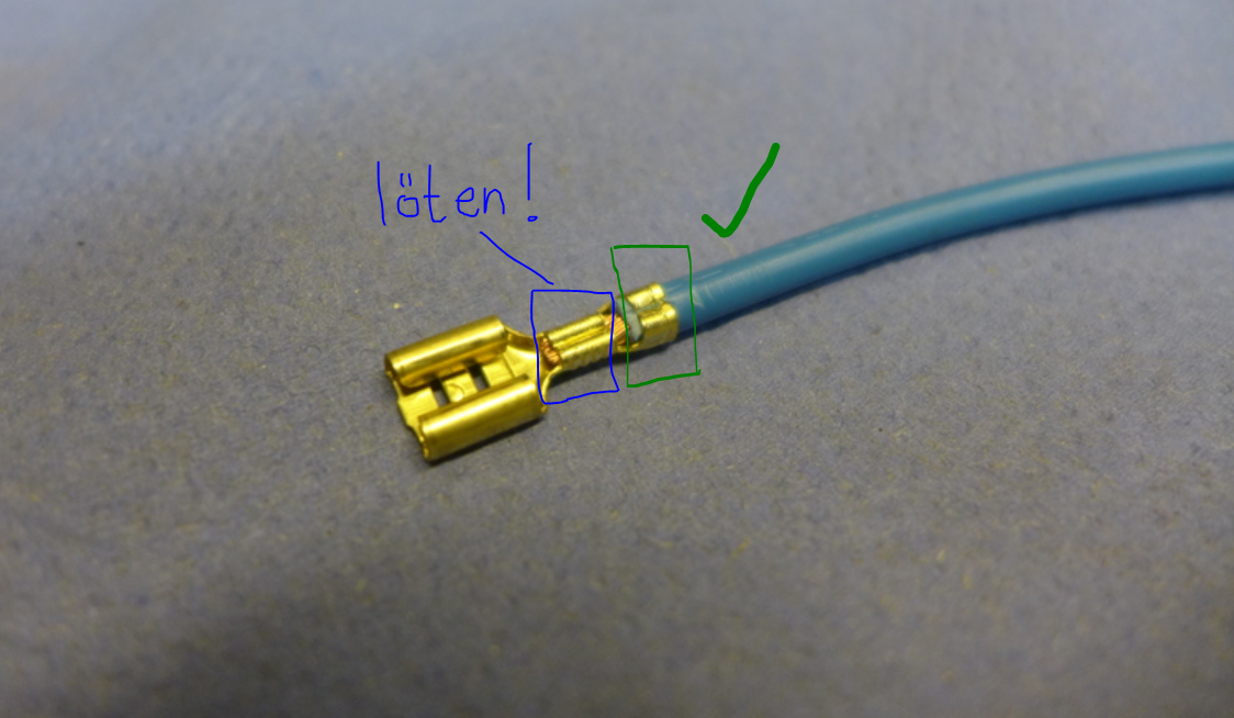 3. die Kabelschuhe werden mit der Kupferseele verlötet, aber nur ganz vorn (siehe Bild)
