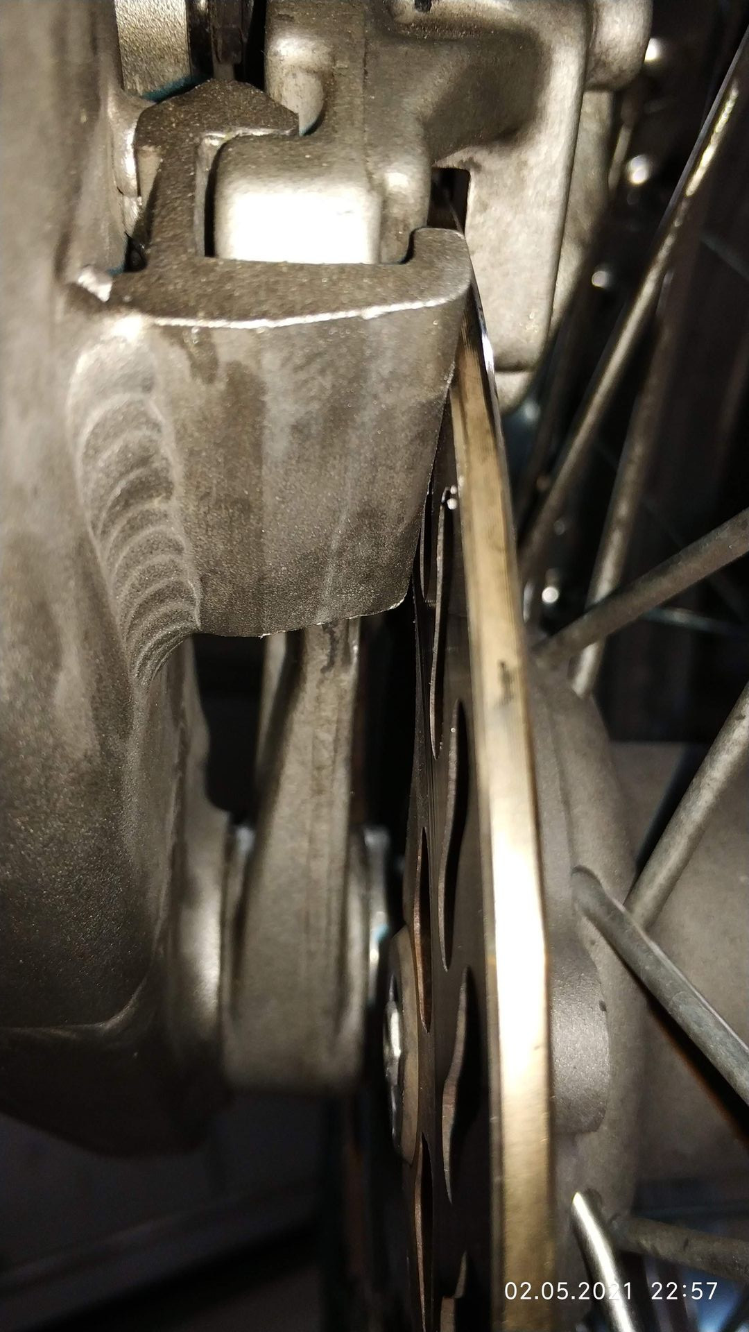Also, nach dem Einbau habe ich bemerkt, dass die Bremsscheibe an der Führung/Aufnahme für die Bremszange ansteht. In Betrieb schleift die Bremsscheibe deshalb auf dem Metall. Ich nehme an, diese Führung ist Aluguss oder so, also Angst habe ich nicht, dass die Bremsscheibe zu heiß wird oder so, aber kann doch auch nicht sein, dass da gar kein Spiel vorhanden ist. Ich glaube auch, dass das nicht so gewesen ist vor dem Ausbau des Hinterrades. Einstellungen zur Kettenspannung habe ich vorher fotografiert und genau gleich wieder so hingestellt. Komisch.