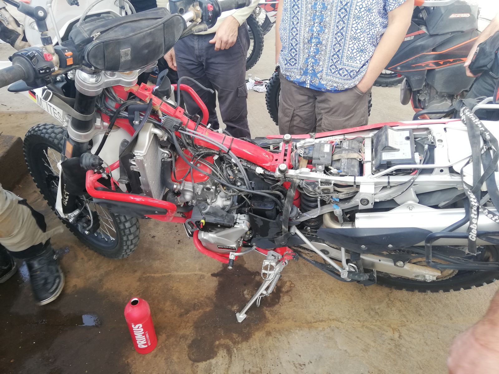 Entschied mich, dann gleich auf die Maschine zu steigen und ein paar Kilometer zu fahren. Nach 50 Kilometern schaute ich nochmal in den Tank - der Pegel war sichtbar geringer. Doch leider tropfte es immer noch unter dem Motorrad. Etwa 1,5 Tropfen pro Sekunde!