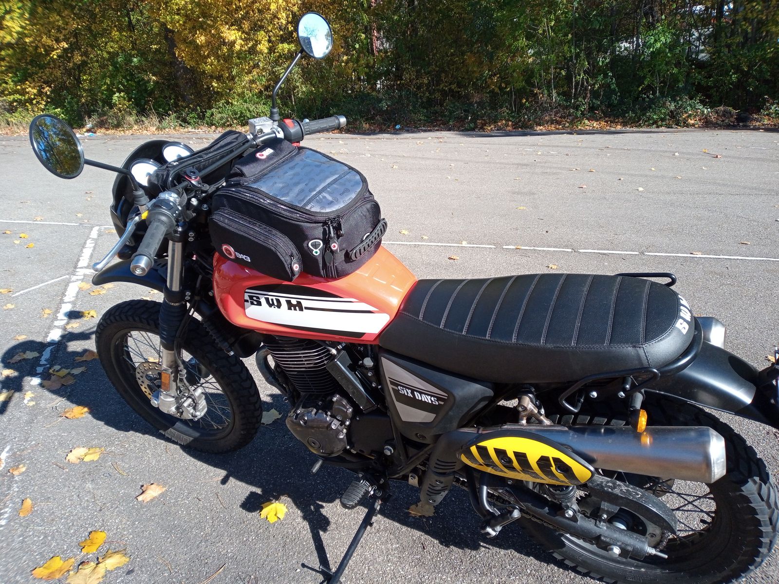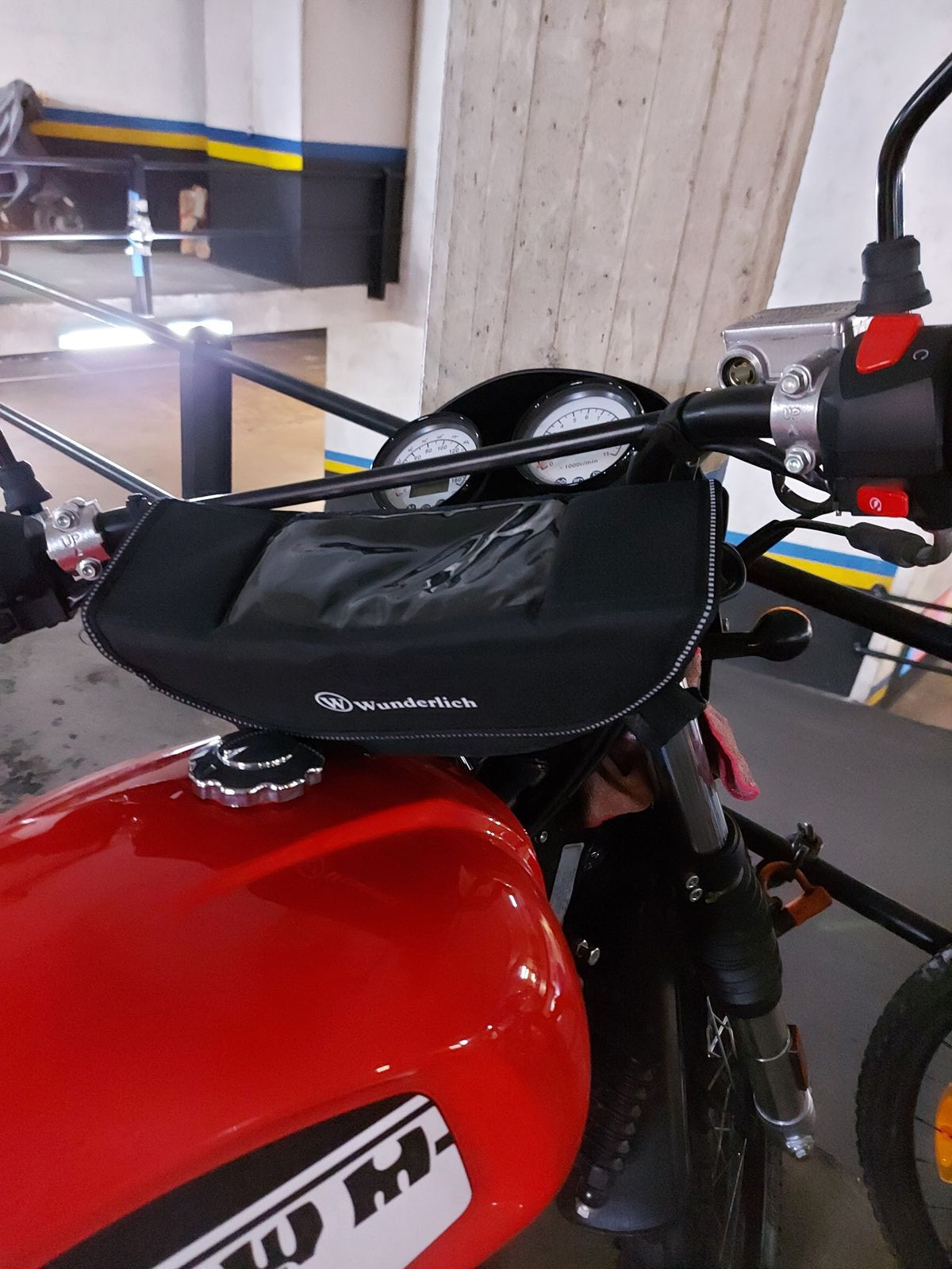 Dann habe ich mir ebenso neuwertig gebraucht die Wunderlich Lenkertasche gekauft. Die passt erwartungsgemäss sehr gut an den hohen Originallenker der Six Days. Fotos anbei.
