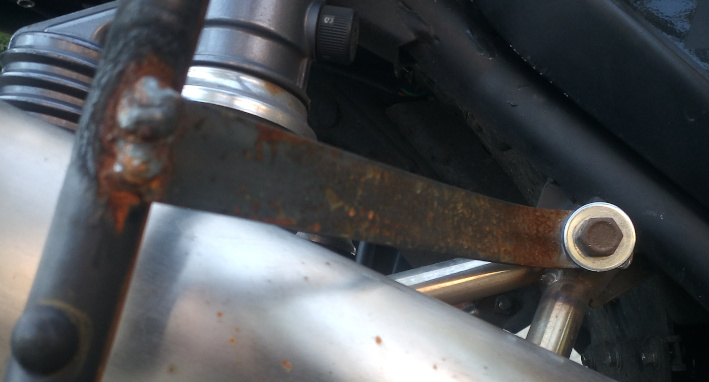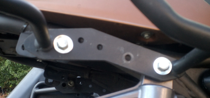 Ein Teil ist an der Stoßdämpferaufnahme verschraubt, ein anderer Teil mit einer M8 Langmutter am Rahmen.