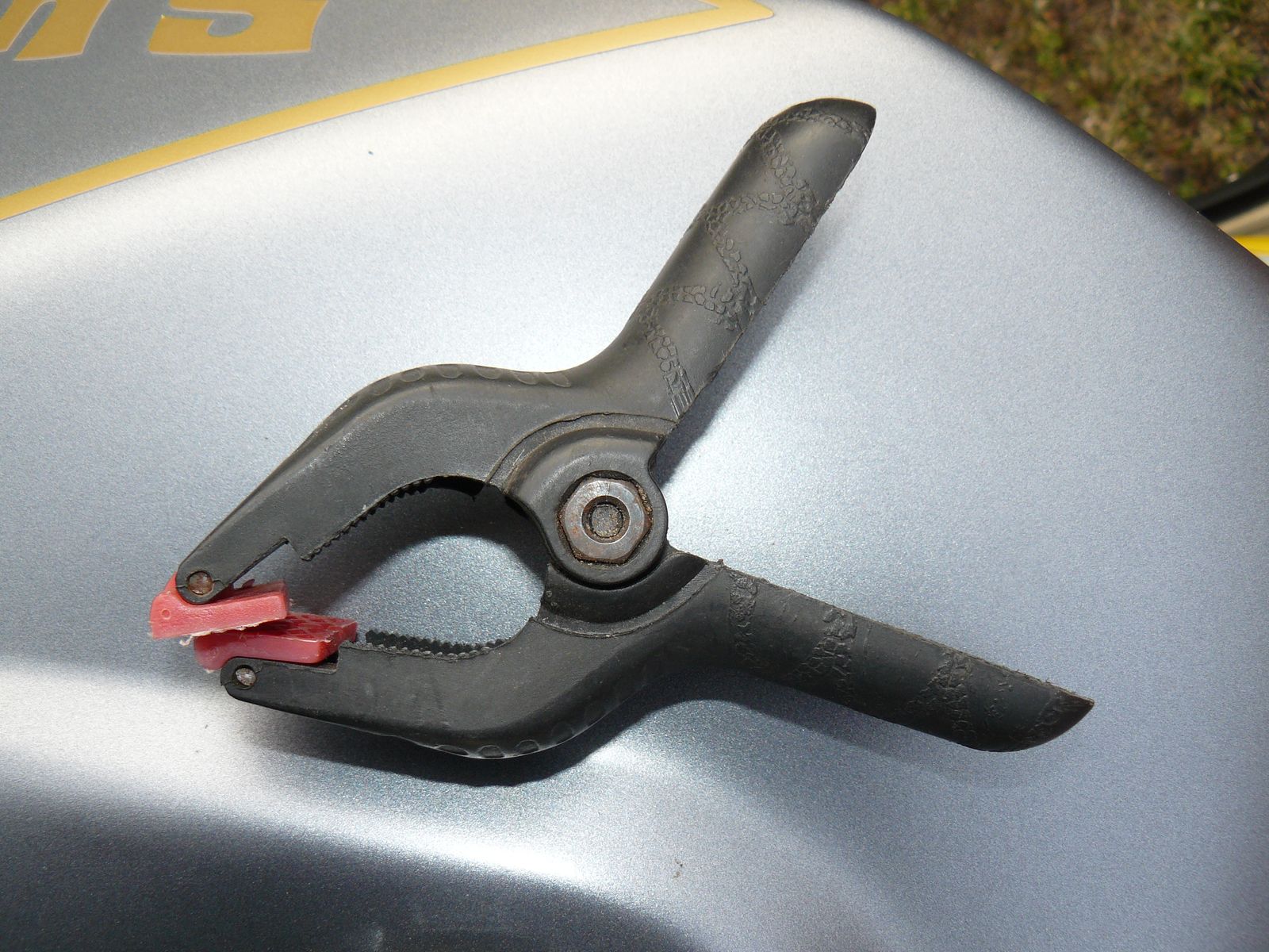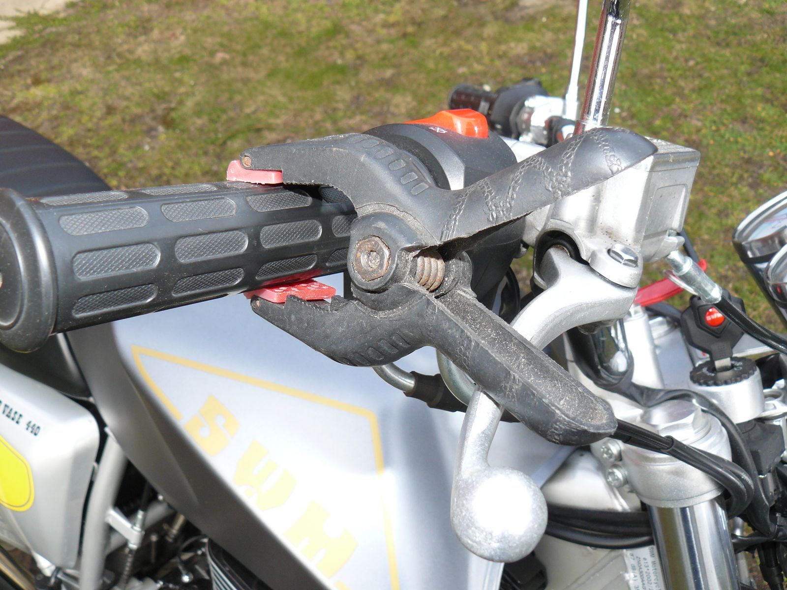Um die Phase bis zum Warmwerden und damit zu einem stabilen Leerlauf im Stand zu überbrücken, habe ich folgende Konstruktion ausgedacht: Man nehme eine stärkere federbelastete Zwinge/Klammer (ähnlich einer Wäscheklammer in XXL, gibt es im Baumarkt oder in Billigläden als Leimzwinge) und befestige diese am Gasdrehgriffgummi. Dann öffnet man das Gas soweit, bis ein stabiler Leerlauf gegeben ist und dreht die Zwinge/Klammer so, dass ein Klammerholm am Handbremshebel anliegt. Hierdurch bleibt der Gasdrehgriff in einer leicht geöffneten Stellung mit erhöhter Drehzahl. Bis man Handschuhe und Helm angezogen hat, ist meistens eine Motortemperatur erreicht, die eine stabile Leerlaufdrehzahl ergibt. Zwinge/Klammer abnehmen und fertig.