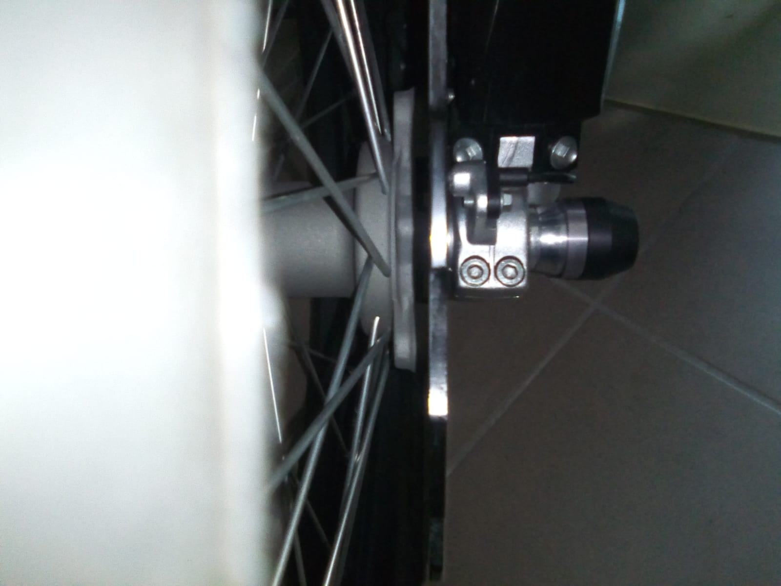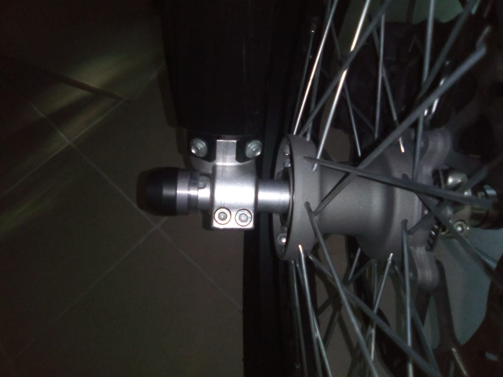 Da die vordere Steckachse hohl ist, habe ich mir bei Ebay einen Gabelprotektor für eine aktuelle Triumph Trident geholt und mit zwei zusätzlichen Drehteilen aus Aluminium passend gemacht. Ist nichts besonderes.
