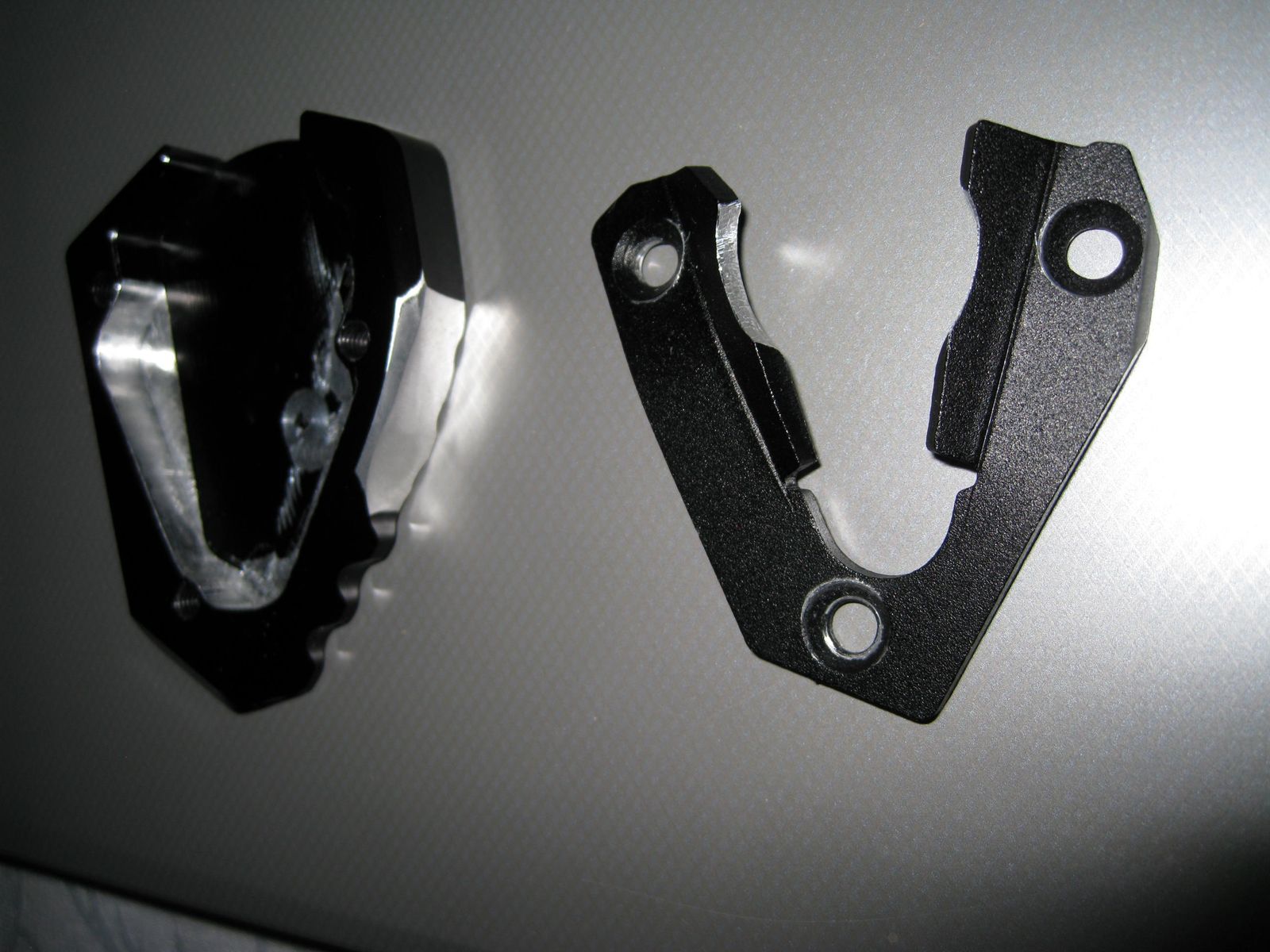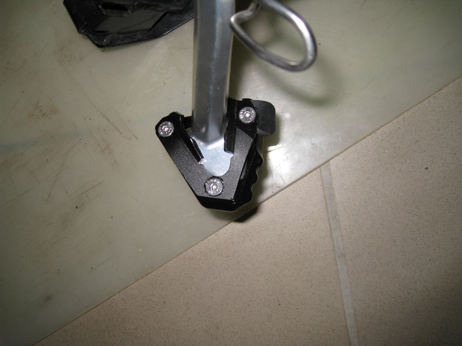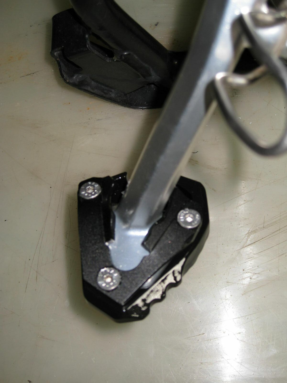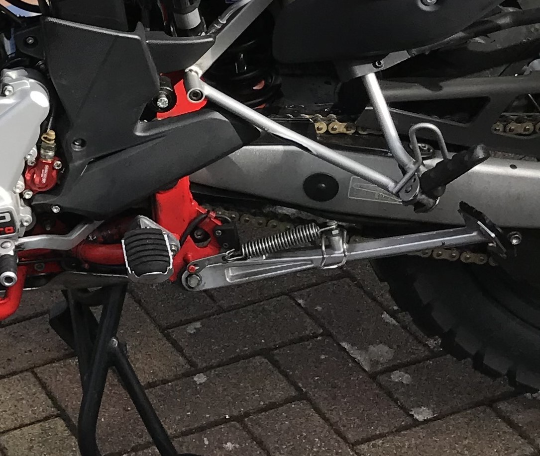 Bei der Superdual T ist ein kürzerer Seitenständer verbaut. Dort gab es auch noch ein Kollisionsproblem mit dem Träger der Fußraste. Auch der Seitenständer musste im Bereich der drei Schrauben angepasst werden. Die Grundplatte musste aufwendig ausgefräst werden. Ideales Werkzeug ist ein Dremel und eine Fräse. Die beigelegten Schrauben waren auch zu kurz.