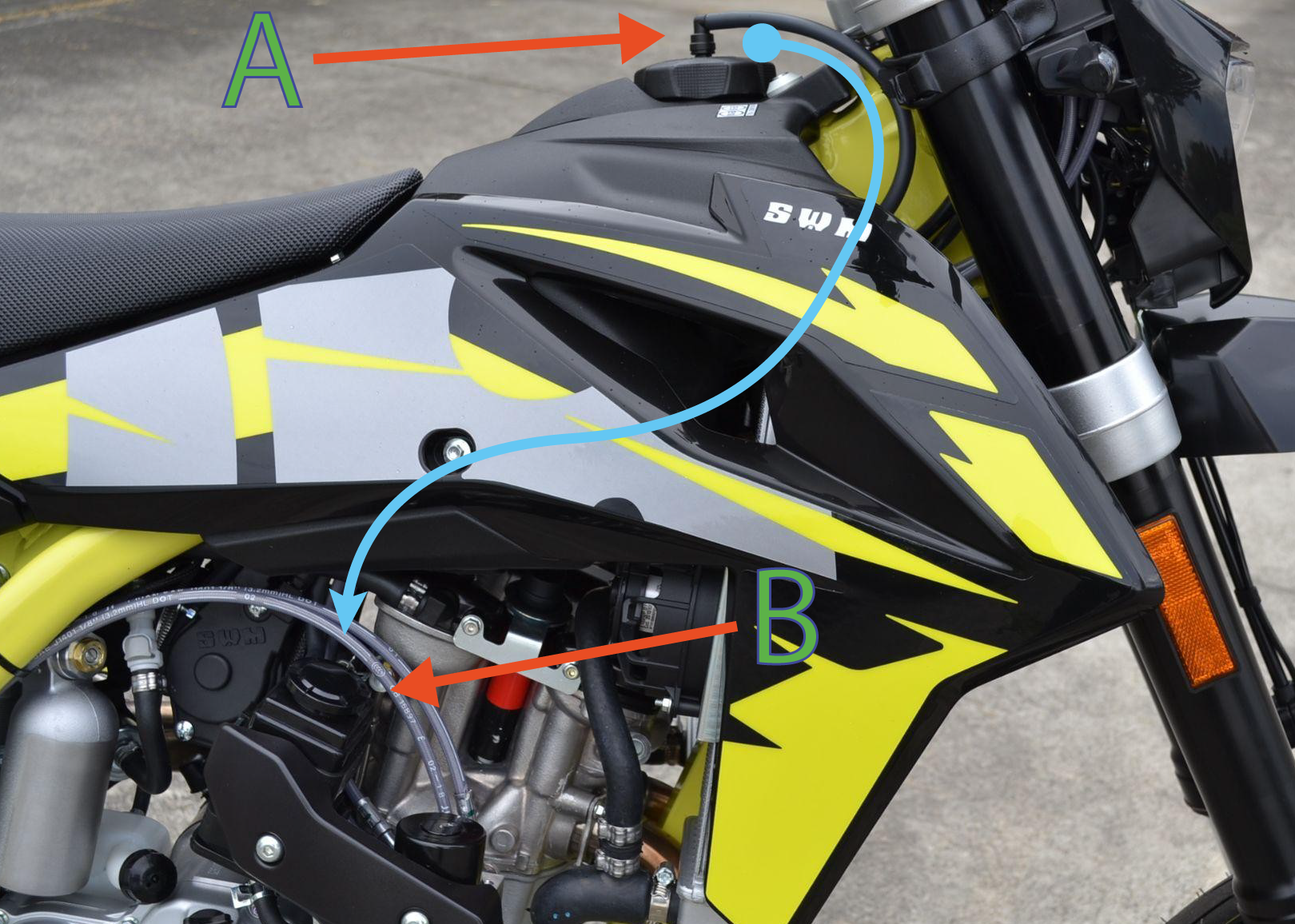 Und noch ein Frage, nun zu dem Tank. Es gibt ein Schlauch der vom Deckel zu einer Box geht, hab eich mal in ein Foto eingezeichnet. Was macht der Schlauch? Was für ein Box ist das? Kann ich den Deckel wechsel, zu einem ohne Schlauch, dafür mit Schloss?