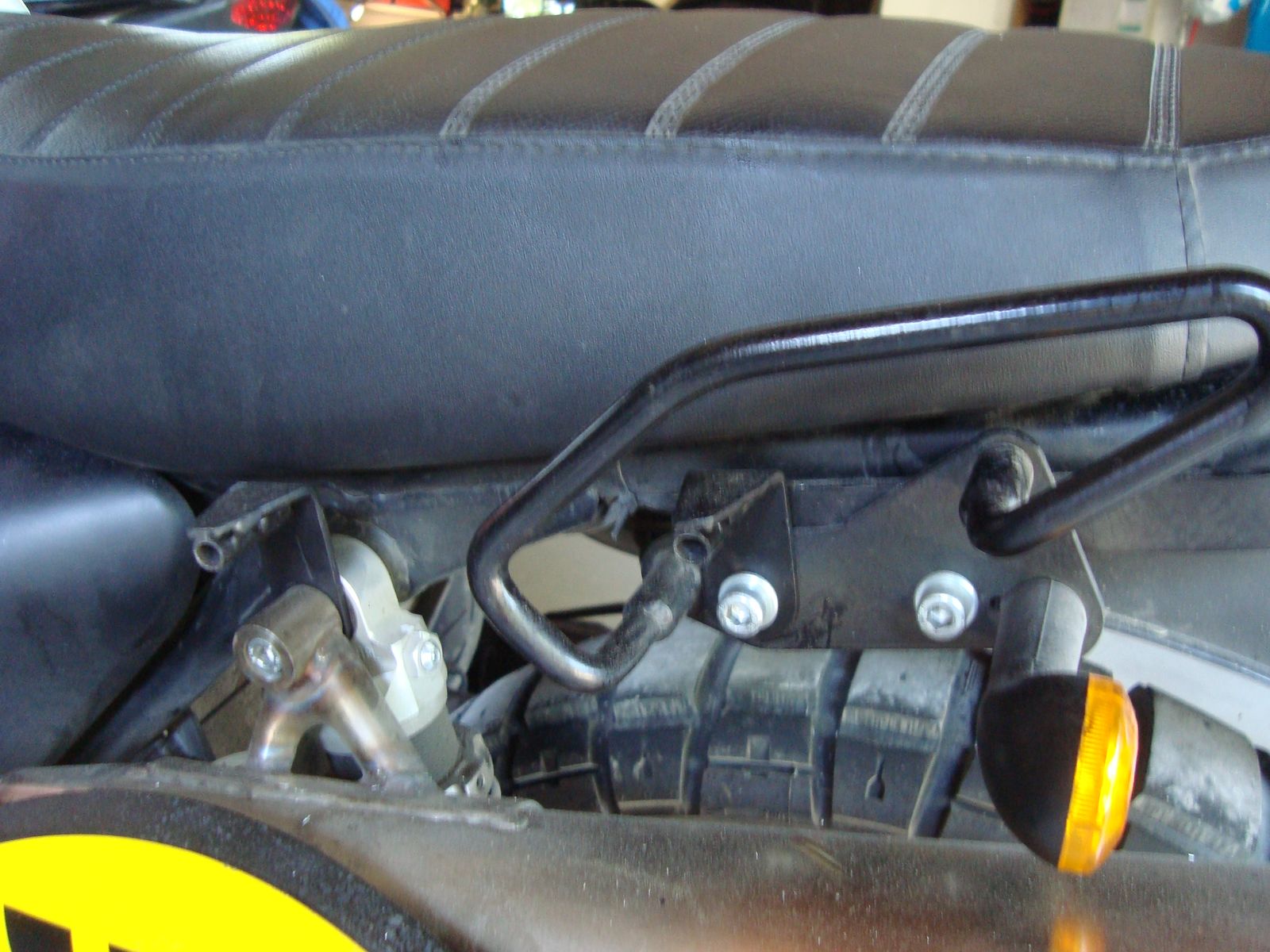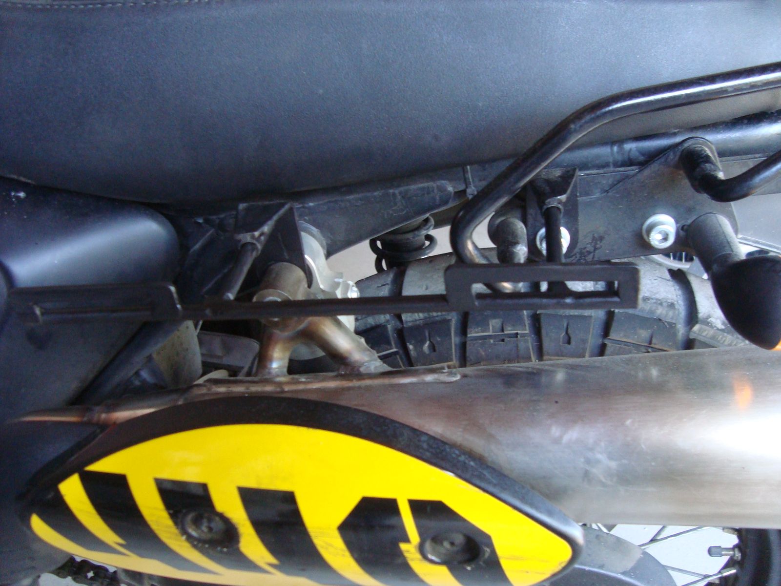 Schritt 1: Befestigungswinkel mit angeschweissten Steckhülsen gemacht und am Rahmen verschraubt (die bleiben auch ständig dran). Einer am Federbein, der andere an der vorderen Bügelschraube.