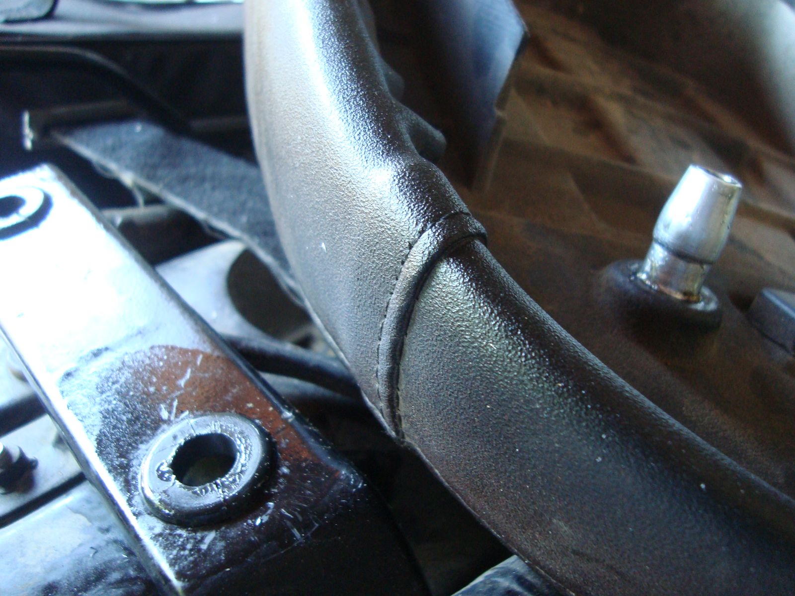 Schritt 3 : Logisch, dass für die bescheuerte Anschraublösung der Sitzbank ein Ersatz her musste, denn die Klettverschlüsse liegen ja unter der Sitzbank. Also die Bohrungen in der hinteren Sitzbankhalterung mittels Stufenbohrer aufgebohrt und Gummitüllen eingesetzt und diese mit Sekundenkleber gesichert. Dann ein Stück Alu-Rundmaterial in die Drehmaschine gespannt und Fixierbolzen gedreht. Zwischendurch probiert, bis die richtige Arretierungskraft gegeben war. Nach diesem Muster den 2. Bolzen gedreht und auf die vorhandenen Sitzbankschrauben aufgedreht.