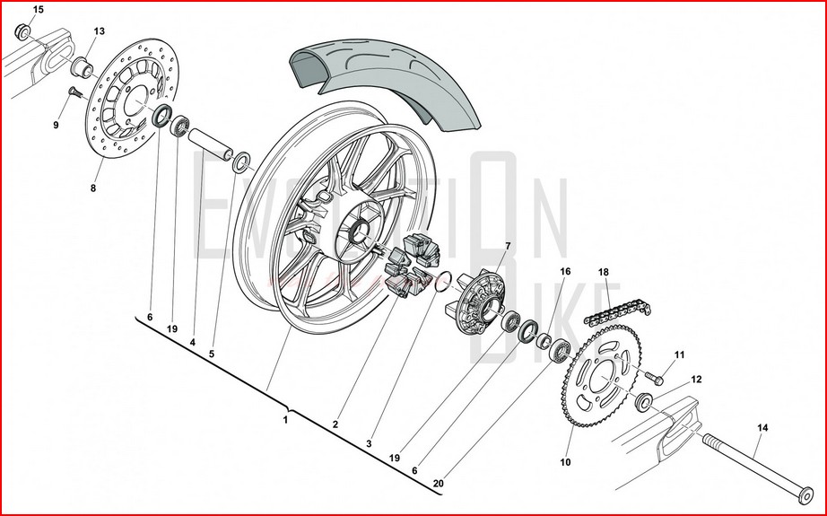 Nein das Teil 16 ist innerhalb der Nabe, die Distanz buchsen 12 + 13 liegen zwischen Schwinge und radlager.