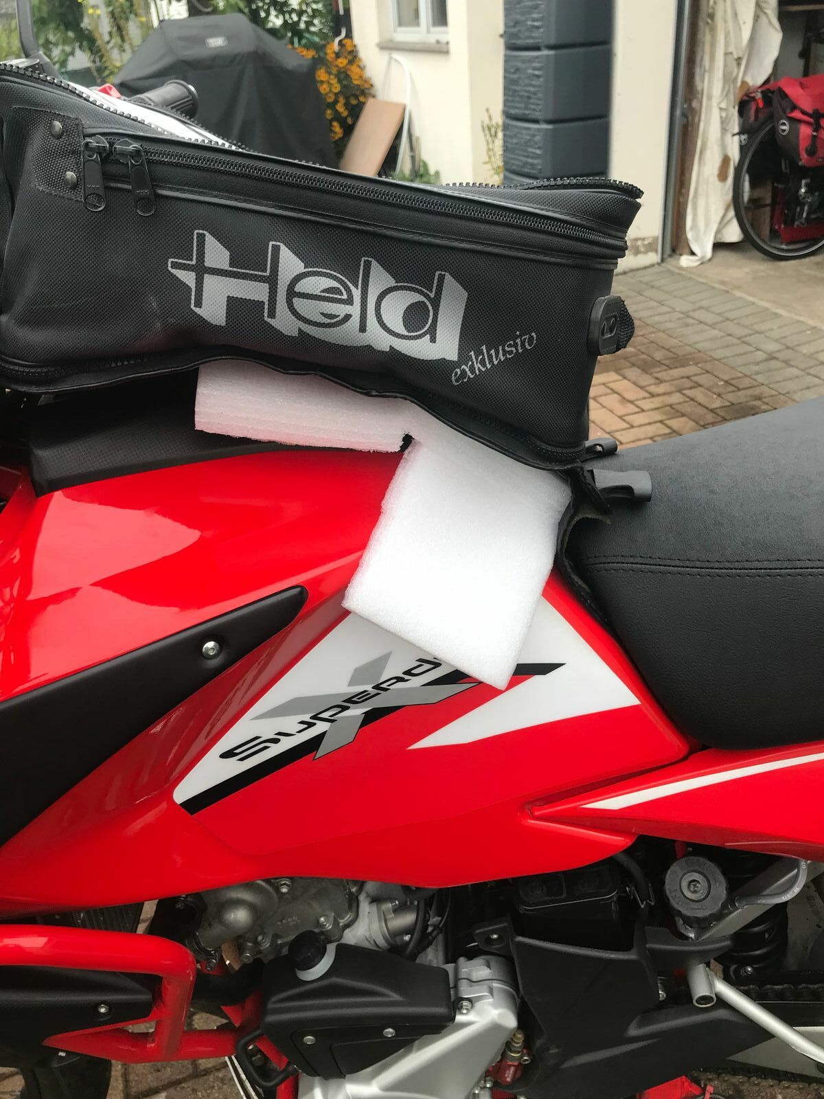 Dann habe ich noch meinen alten Held Tankrucksack versucht zu verbauen, aber mal so ruck zuck ist das Ergebniss nur funktionell aber noch nicht optimal, sitzen lässt es sich gut aber es bedarf noch einer Schaumplatte, die den Tankrucksack besser wackelfreier gegen den tank stützt .