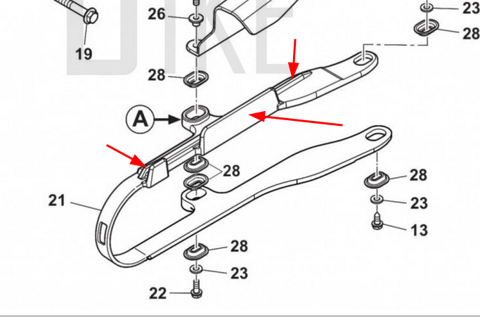 Wenn ich mir das Teil bei Evolutionsbikes anschaue, dann müsste der Kunsstoff im rechten Winkel zur Auflagefläche stehen (mittlerer Pfeil), bei mir ist das Teil aber nach innen gebogen. Die Kette als solche müsste in einer Art Führungsschiene laufen oder wie deutet ihr den Streifen in der Mitte (äußere beiden Pfeile). Ich schau mir das nochmal beim Händler an einer neuen Maschine an.