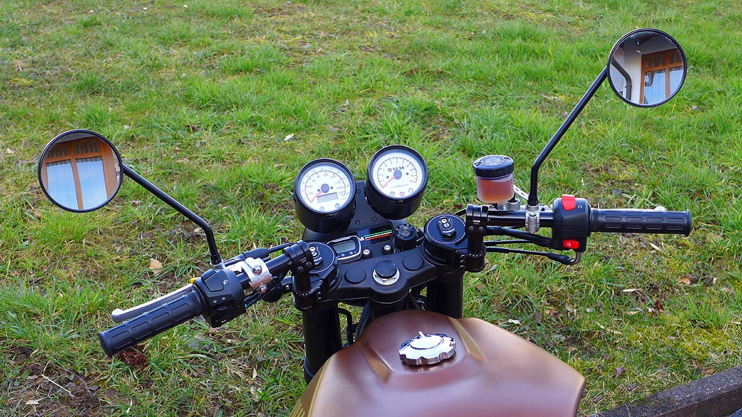 der hohe Lenker ist ein Stummellenkerumbau von ABM auf den MultiClip-Tour, Durchmesser 55mm, mit 30mm Lenkerverbreiterung.